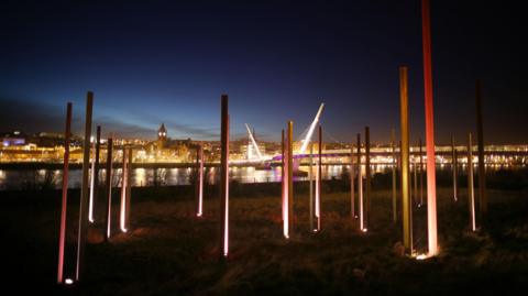 Mute Meadow, a series of illuminated steel columns on the banks of the Foyle, was unveiled in 2011.