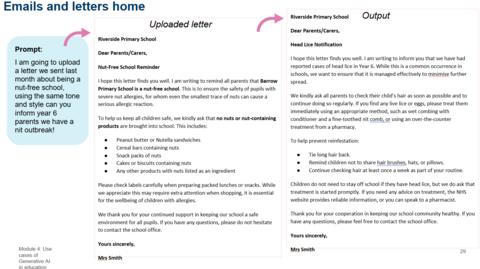 One section demonstrates how it could be used to generate a letter about a head lice outbreak, for example.