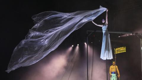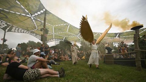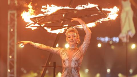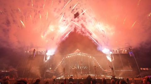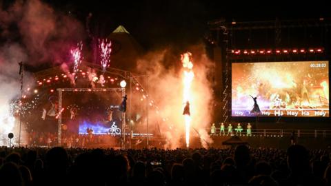 As night fell, for the first time in 35 years, the event hosted an opening ceremony from a theatre and circus act in front of the Pyramid Stage.