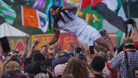Crowd surfing: Bob Vylan performed on the West Holts stage.