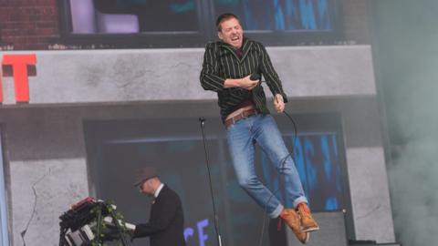In the air: Kaiser Chiefs opened the Pyramid Stage on Saturday