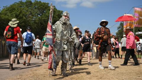 Exploring Glastonbury: While everyone else is running around in T-shirts and shorts, one person was spotted dressed like an Arctic explorer.