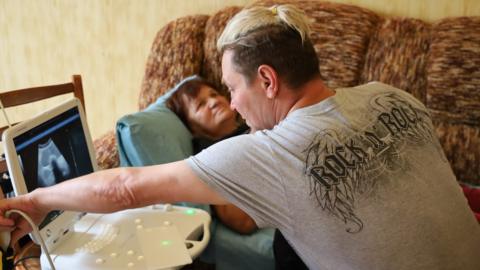 In a rural village close to the Ukrainian front line, a group of women queue quietly outside a purple and white ambulance, waiting to be seen by a doctor with his shaved head dyed the blue and yellow of the Ukrainian flag.