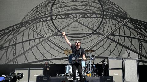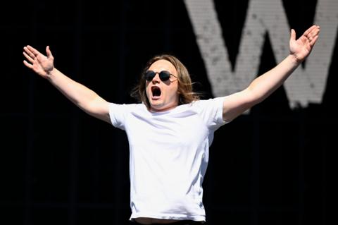 Rhian Teasdale of Wet Leg powers through the Friday heat on the main stage