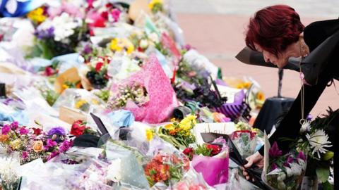 A tearful Sharon Osbourne added a pink rose to dozens of tributes that have been left by fans in central Birmingham, consoled by family members including children Kelly and Jack.