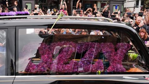 The funeral procession was led by a brass band playing Black Sabbath songs, with Ozzy's body transported in a hearse topped by a purple floral tribute in the shape of a cross.