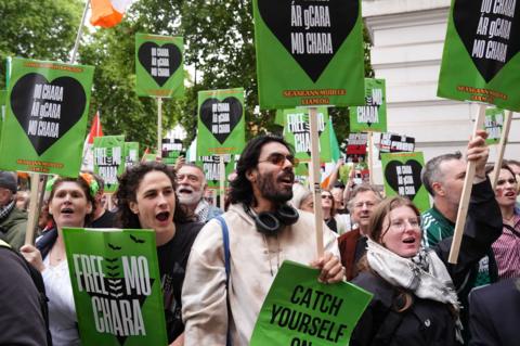 Liam Óg Ó hAnnaidh appeared at Westminster Magistrates' Court on Wednesday and was met by a large crowd of supporters - many with Palestinian flags.