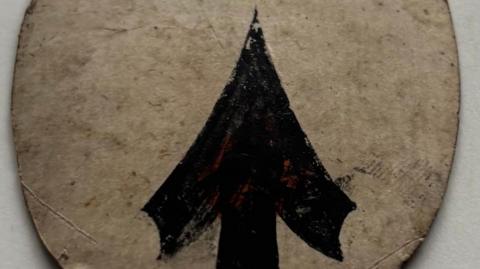 "The reverse of this playing card was originally a red heart, but most unusually, the heart has been deliberately obliterated and painted over with a black arrow.