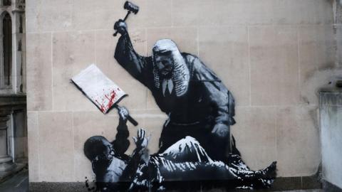 The mural appeared on an external wall of the Queen's Building, in the Royal Courts of Justice complex, on Monday.