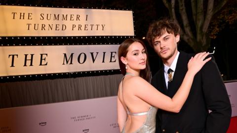 Series star Lola Tung (Belly) posed on the red carpet in front of a billboard announcing the film accompanied by co-star Christopher Briney (Conrad).