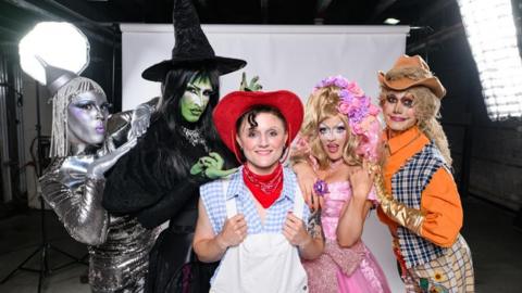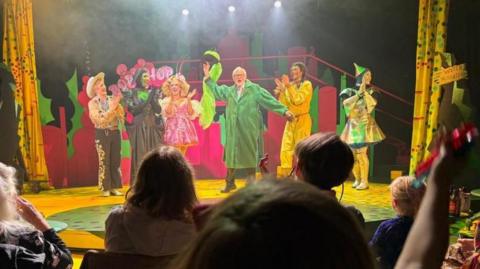 In a pre-recorded video that's beamed on to the stage, Corbyn takes on the role of the Wizard of Oz-lington in the community production.