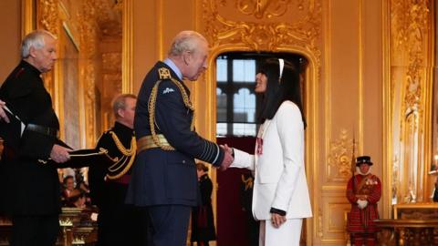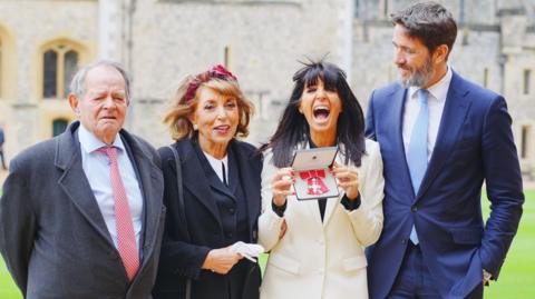 Claudia Winkleman was all smiles on Tuesday after being made an MBE by King Charles III at an investiture ceremony at Windsor Castle.