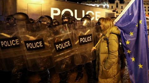 Riot police in Georgia used pepper spray and water cannon against protesters who turned out on the streets of Tbilisi after the government suspended moves to join the European Union.
