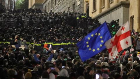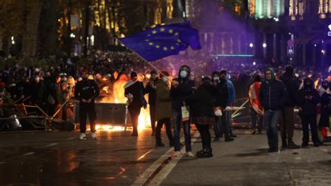 Crowds turned out after Prime Minister Irakli Kobakhidze said his government would drop its pursuit of EU membership "until the end of 2028" - a move criticised by more than 100 diplomats on Friday as "unconstitutional".
