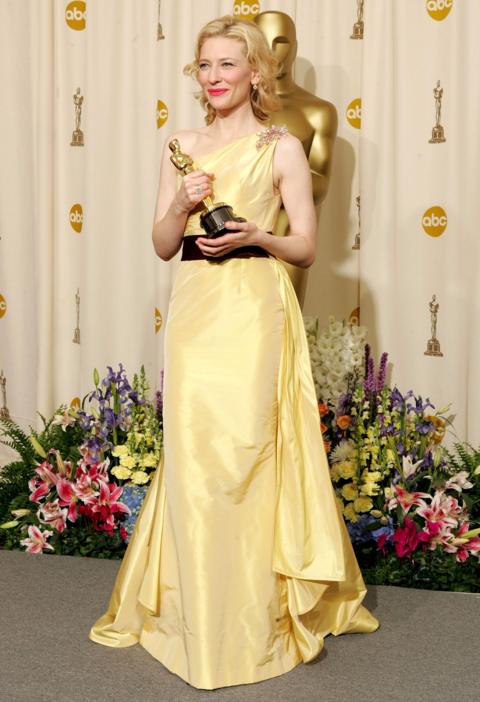 Oscar winner Cate Blanchett poses backstage in a silk-taffeta dress at the 2005 awards