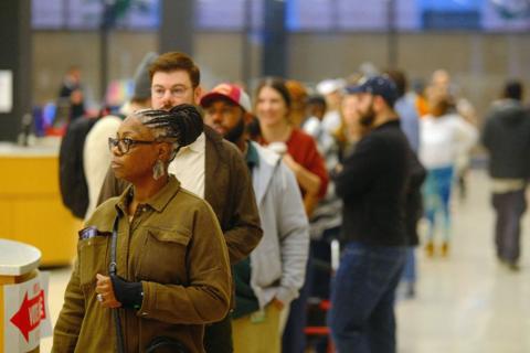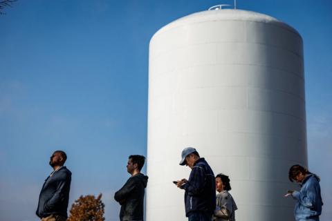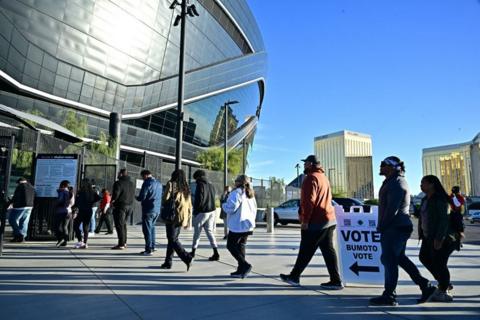People line up to vote at a polling station at Allegiant Stadium in Las Vegas. Nevada, which has six electoral votes, was the last of the seven swing states to open polls.