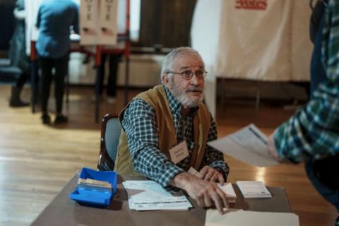 Gene Girdwood, ballot clerk, checks in voters to cast their ballots in Bethlehem, New Hampshire. A presidential election day ballot can be long - two or three white pages.