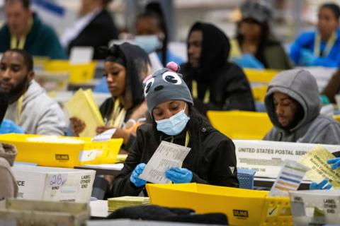 Election workers process mail-in ballots at an election's warehouse in Philadelphia, . Pennsylvania is one of seven states that forbid processing mail-in ballots before 07:00 on Election Day.
