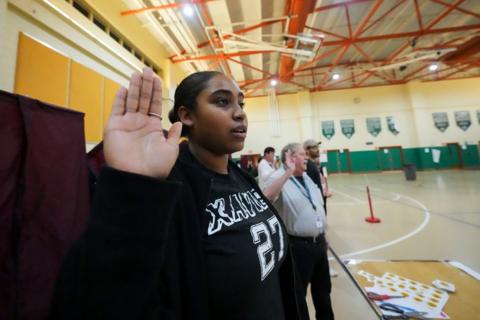 Holyn Robinson, a student and first-time precinct commissioner, takes her oath along with fellow commissioners just before the opening of the polls, at the Hynes Charter School in New Orleans, Louisiana.